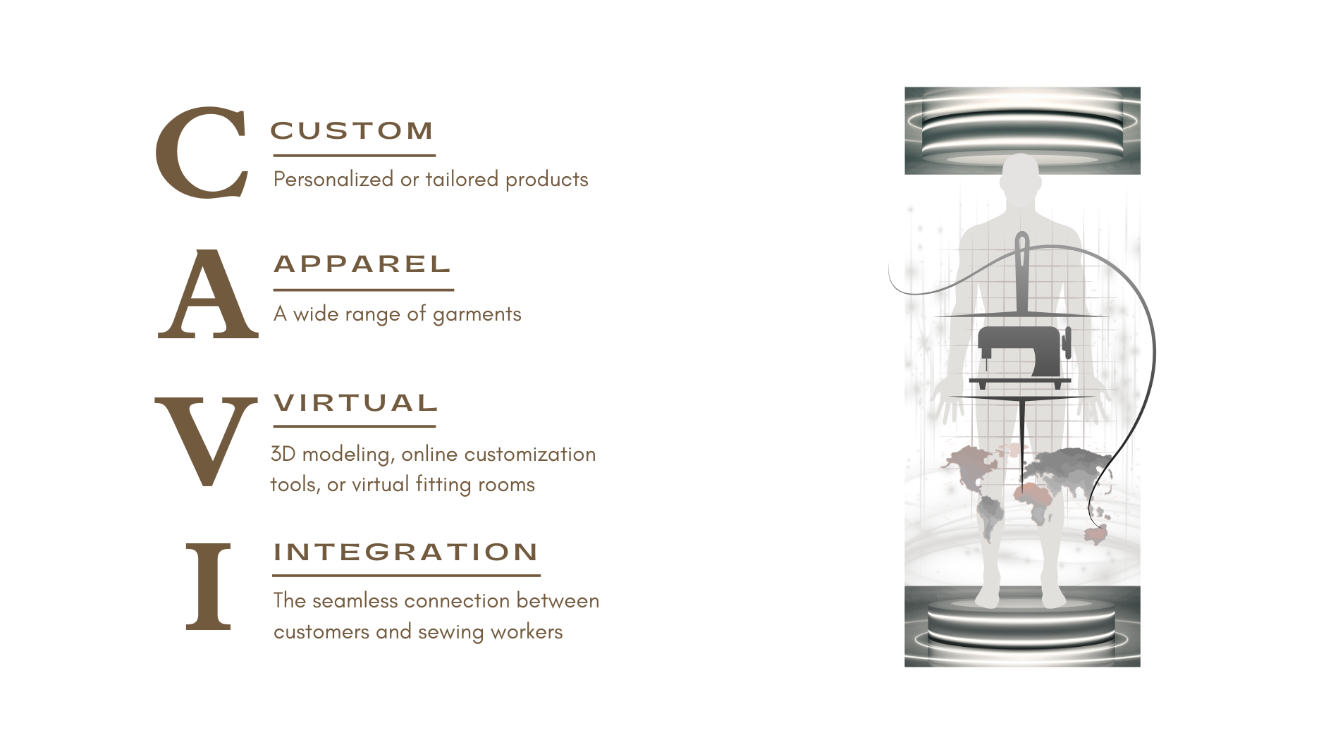 CAVI (Custom Apparel Virtual Integration) is a digital apparel platform transforming how garments are designed, produced, and delivered. Built at the intersection of technology and craftsmanship, CAVI connects customers, designers, and distributed sewing workers through an integrated, data-driven system. Using AI-powered body measurement, intelligent pattern optimization, and fabric efficiency tools, CAVI enables on-demand, scalable, and sustainable apparel production. Our mission is to modernize the apparel supply chain—reducing waste, empowering skilled workers, and delivering precision-fit garments for a global market.