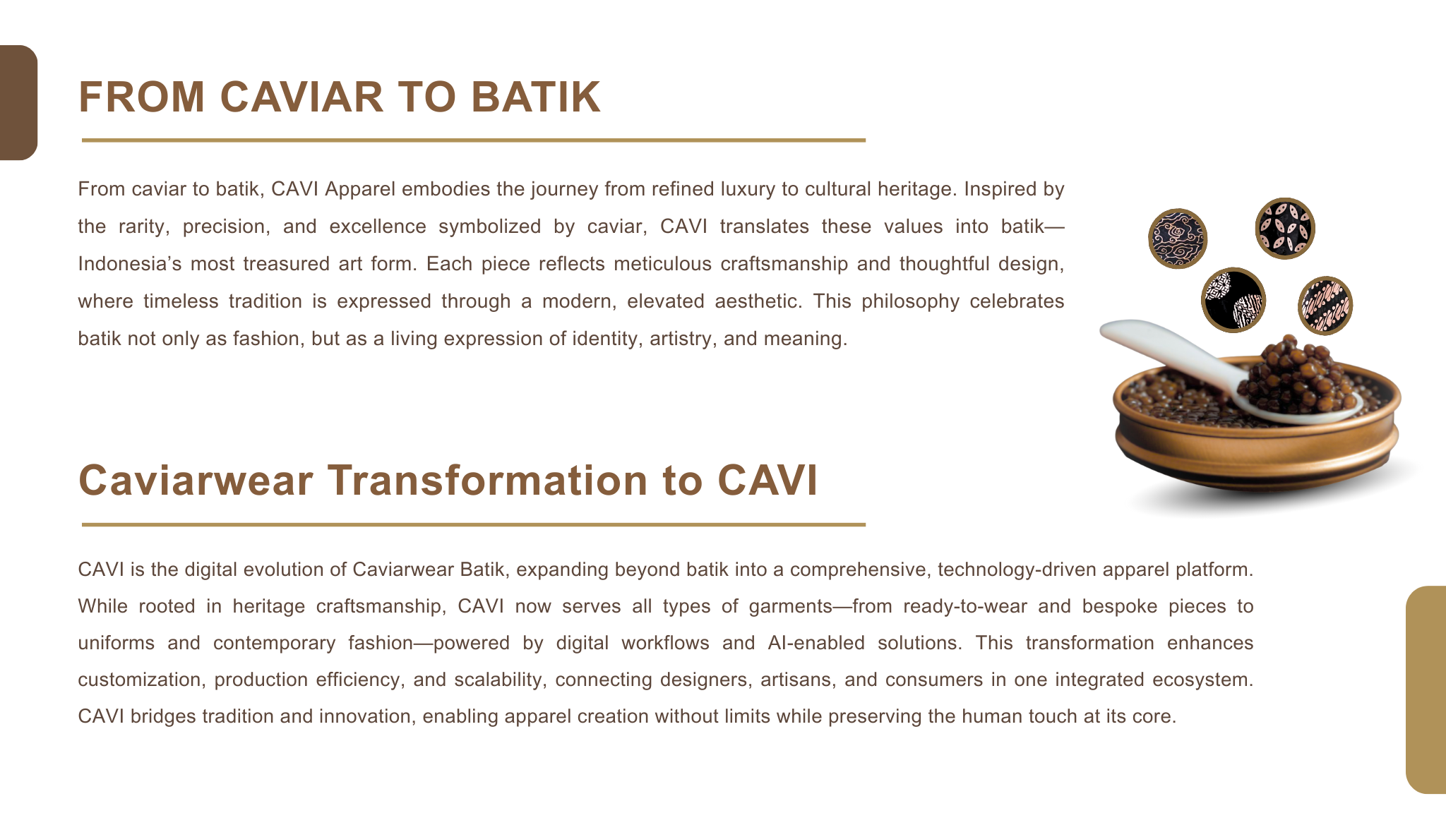 Caviarwear’s journey is a story of patient growth—shaped by experimentation, craftsmanship, and purpose. From hand-sewn beginnings to collaborations with local artisans, sustainable materials, and digital innovation, every phase strengthened its identity. Moving at its own rhythm, Caviarwear remains grounded in one belief: fashion should empower people, honor culture, and make batik accessible to everyone.